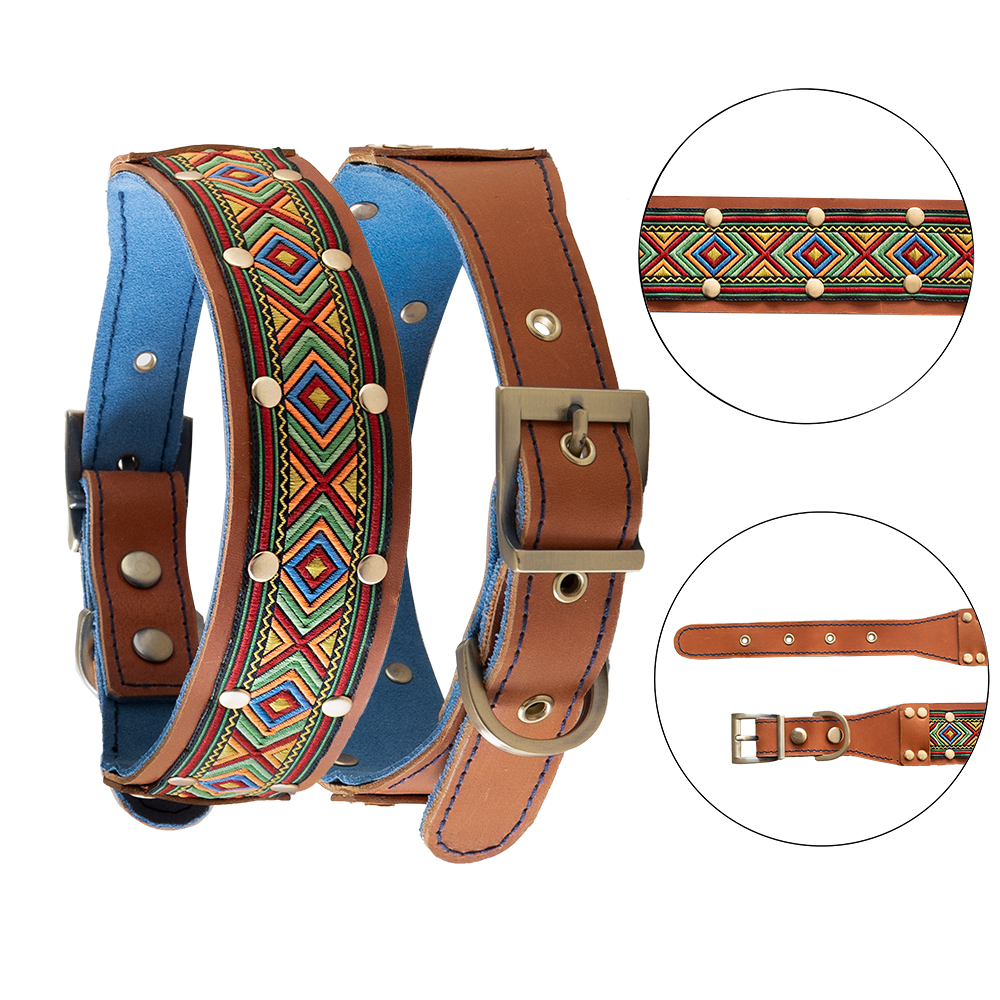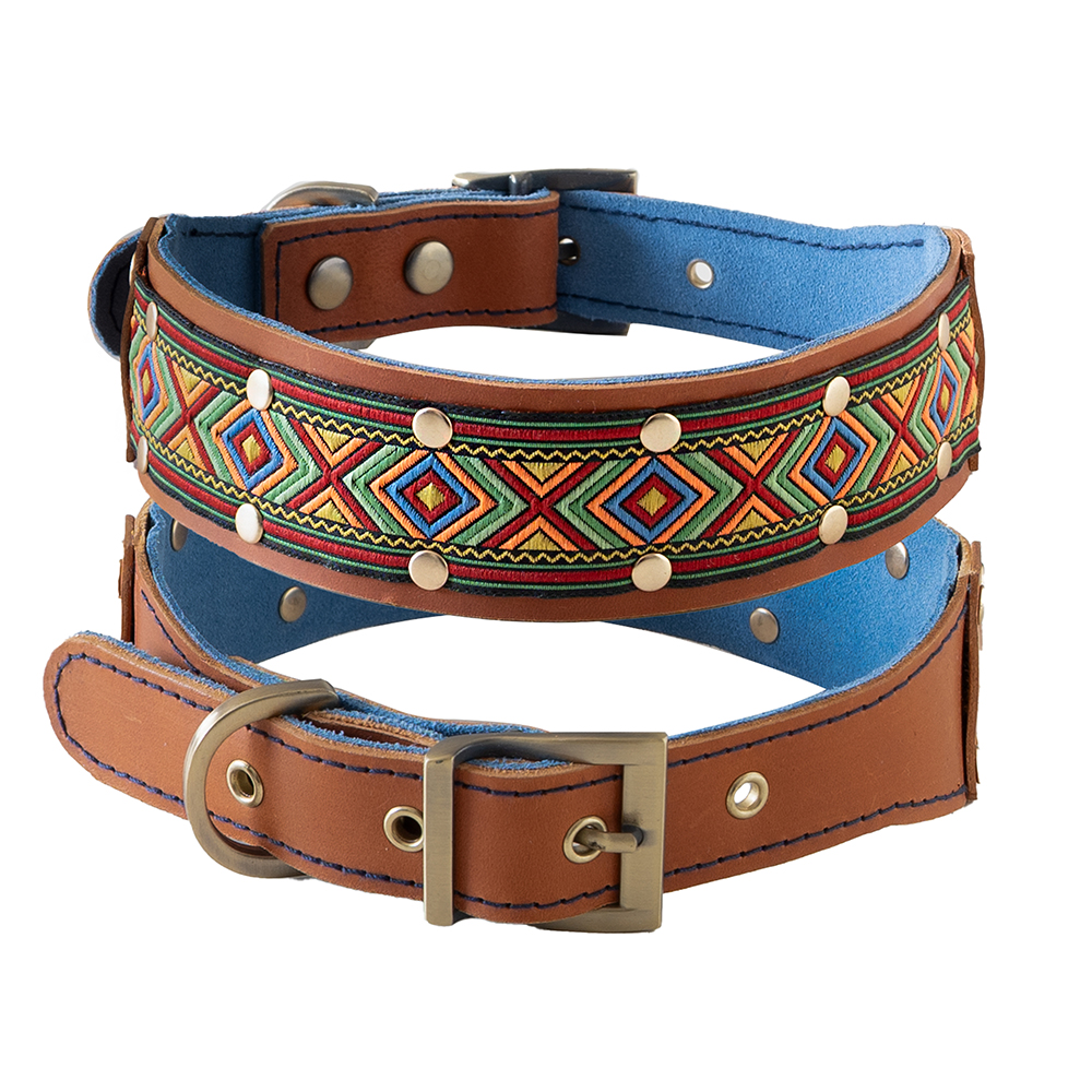El Yapımı Hakiki Deri Etnik Dokuma Kolonlu Köpek Boyun Tasması – Kahverengi | Sürdürülebilir Üretim