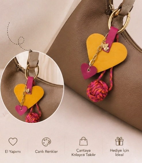 El yapımı hakiki deriden üretilen bu kalp figürlü çanta charmı, özel günlere romantik ve neşeli bir dokunuş sunar. Zamansız tasarımıyla çantalara, anahtarlara ve aksesuarlarınıza şık bir karakter katar.