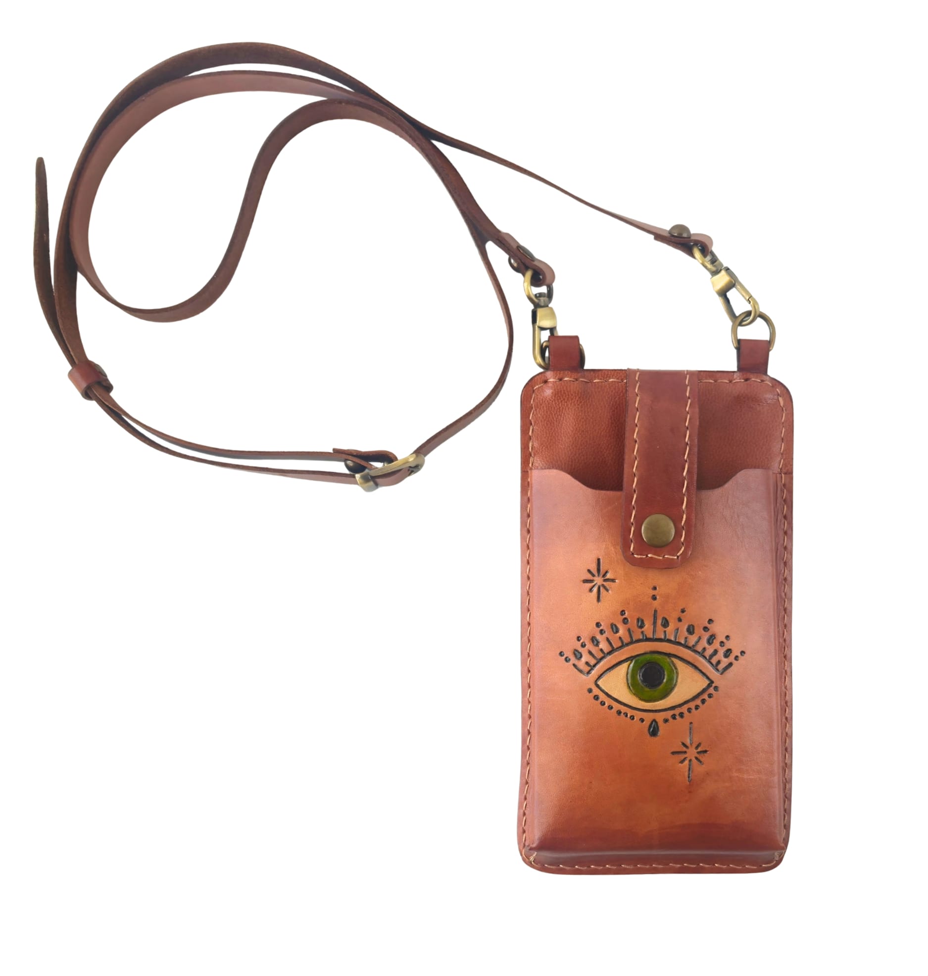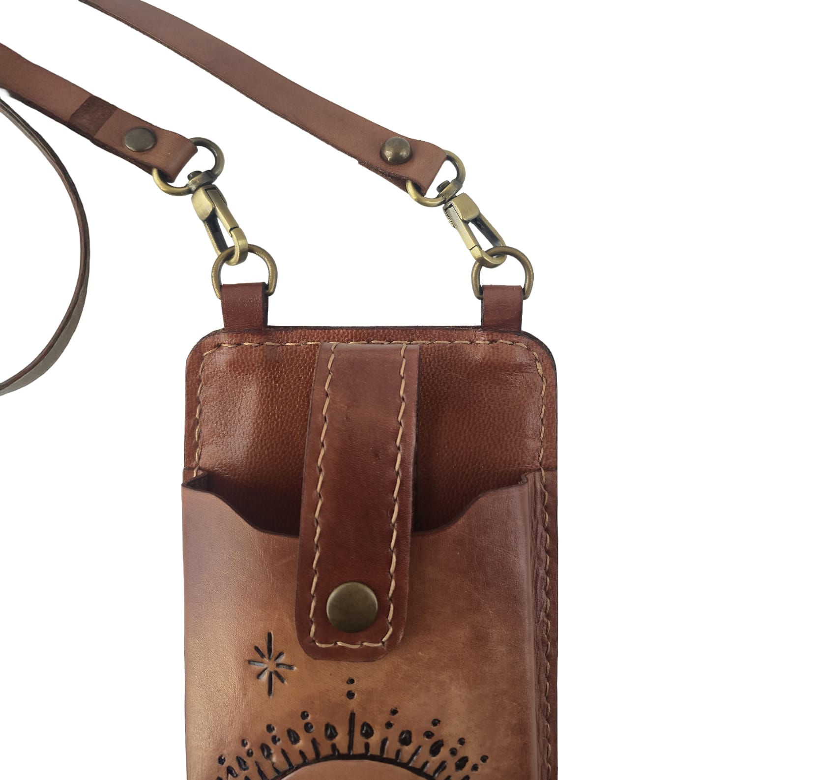 Ön yüzünde çıtçıtlı telefon bölmesi ve arka yüzünde fermuarlı bölümü bulunan Kadın Hakiki Deri Telefon Cüzdan Çanta, eşyalarınızı güvenle taşımanızı sağlar. Nazar Gözü temasıyla detaylandırılan ön yüz, koruyucu bir anlam taşırken bohem ve özgün bir stil sunar.
