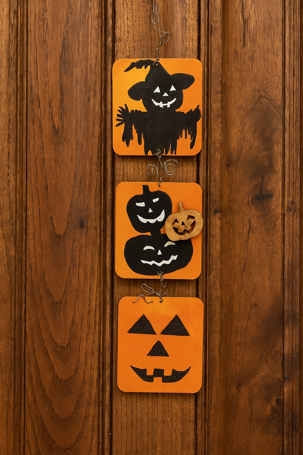 Halloween Temalı Ahşap Kapı Süsü – 3’lü Kare Tasarım | El Boyaması | 10×10 cm | Kadın Emeği | Doğal Malzeme