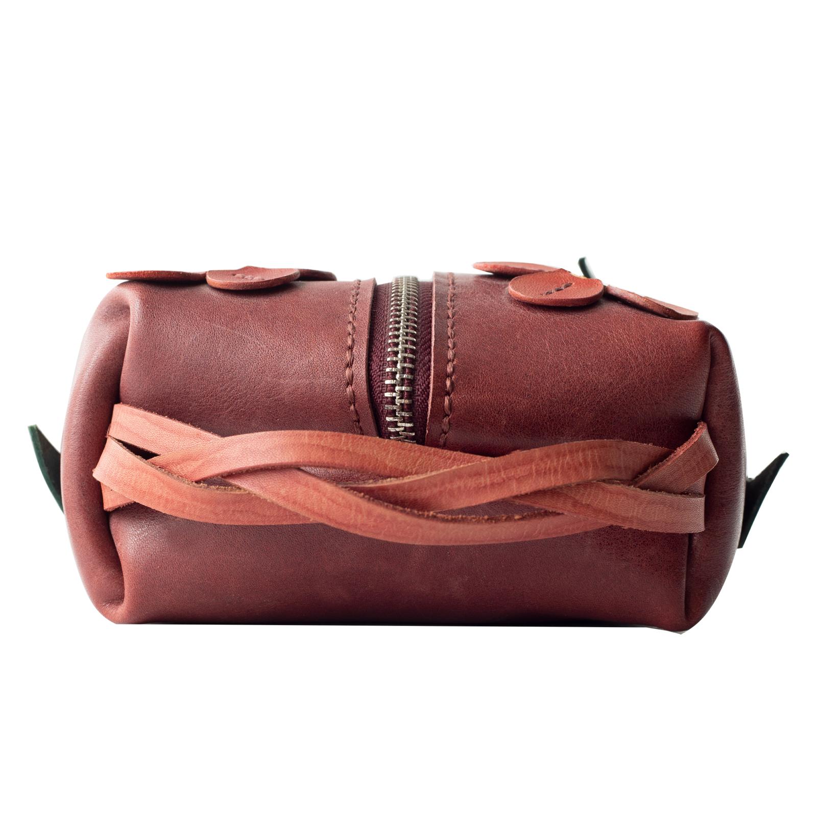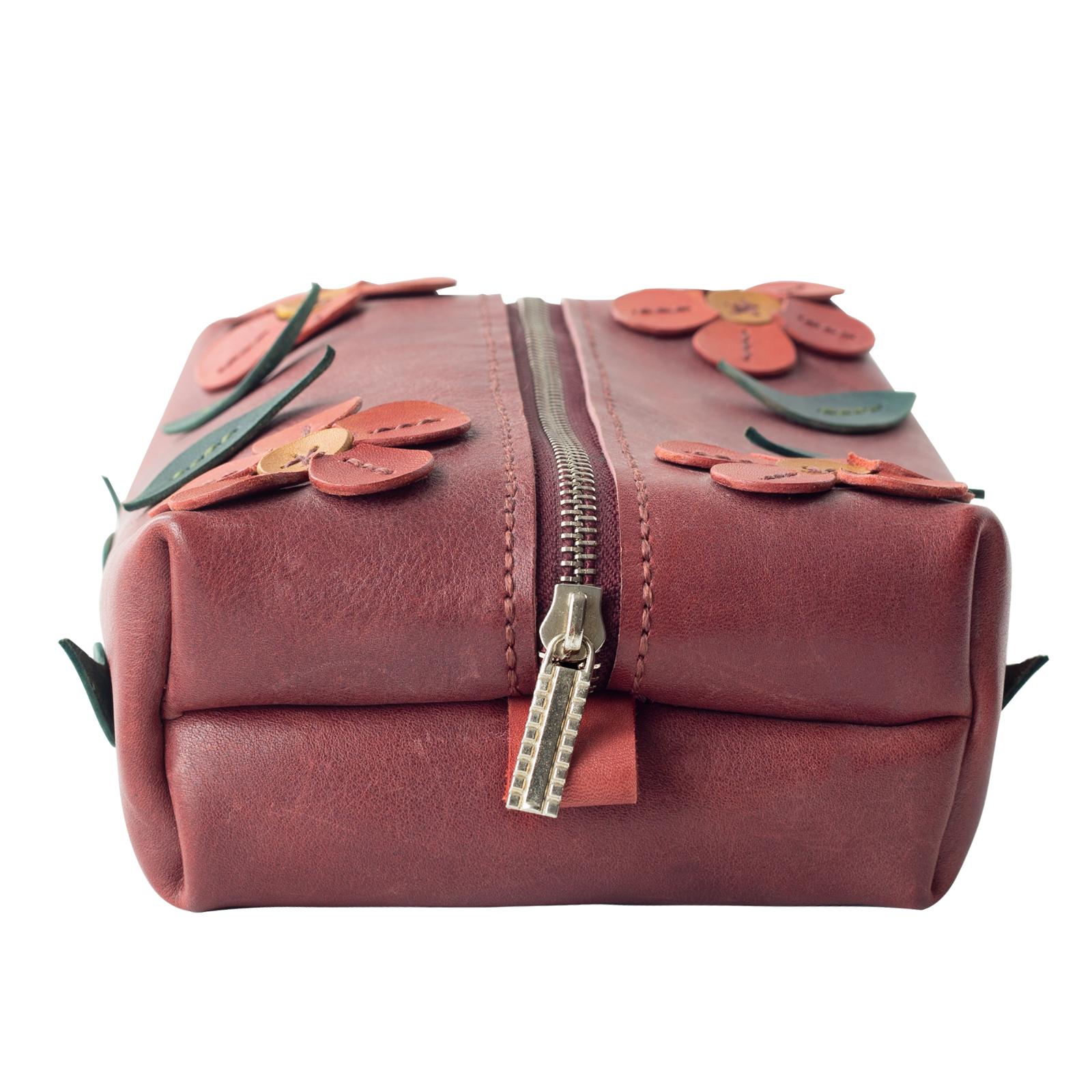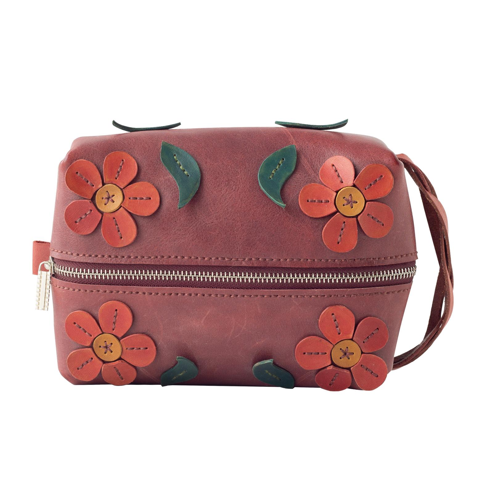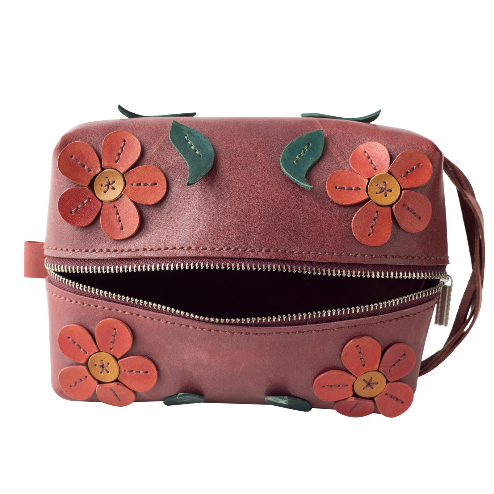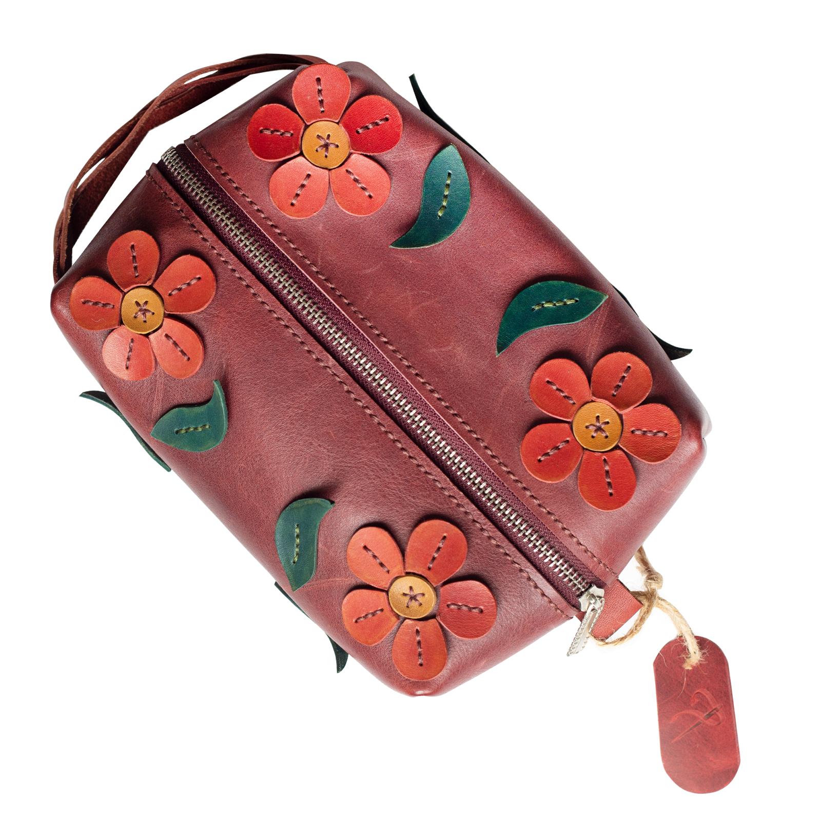 El Yapımı Hakiki Deri Çiçek Desenli Kozmetik Çantası